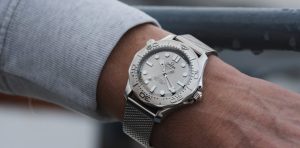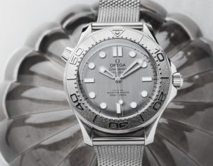 Completing the “Silver Surfer” look is the mesh bracelet. This bracelet style became especially popular in the 1970s, and it looked great on the original Omega Seamaster PloProf, a dive instrument aimed at professional divers who never sat one minute at an office desk. Historically, the mesh bracelet doesn’t have a place on the Seamaster Diver 300M. Also, aesthetically, it even clashes a bit. But just like the Devil’s tritone gives Jimi Hendrix’s “Purple Haze” its catchy yet slightly disturbing hook, the clash of designs of the “Silver Surfer” got me hooked. That said, the quality of the steel mesh bracelet on the very metallic new Seamaster is superb. It’s a luxurious version of a once functional, shark-proof design. The only aspect I struggle with is the thickness around the clasp area.  Three layers of steel on the underside of the wrist is a bit much.